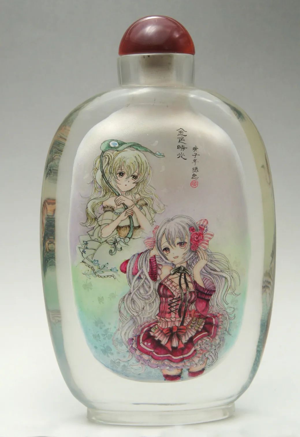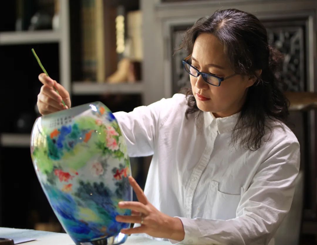 除此之外,绘制《金玉满堂》的载体——多彩琉璃水草瓶,也是文静独创。
