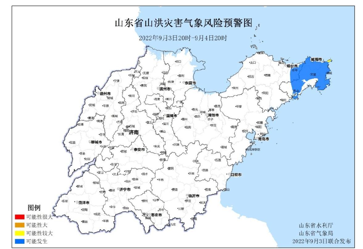 山东省水利厅和山东省气象局9月3日联合发布山洪灾害气象预警:预计9月3日20时至9月4日20时,威海市局部地区发生山洪灾害的可能性较大(黄色预警),烟台、威海等市局部地区可能发生山洪灾害(蓝色预警)。