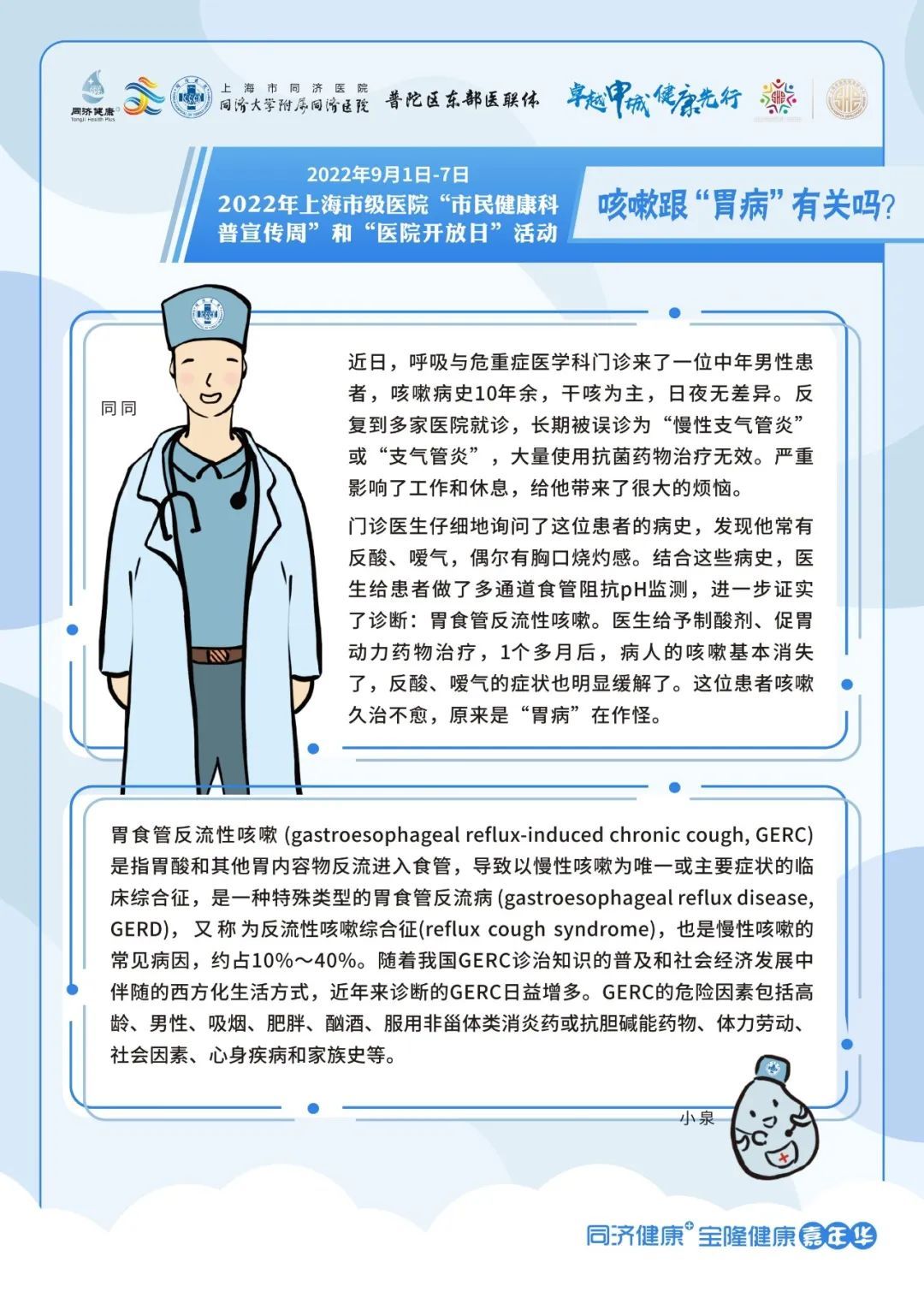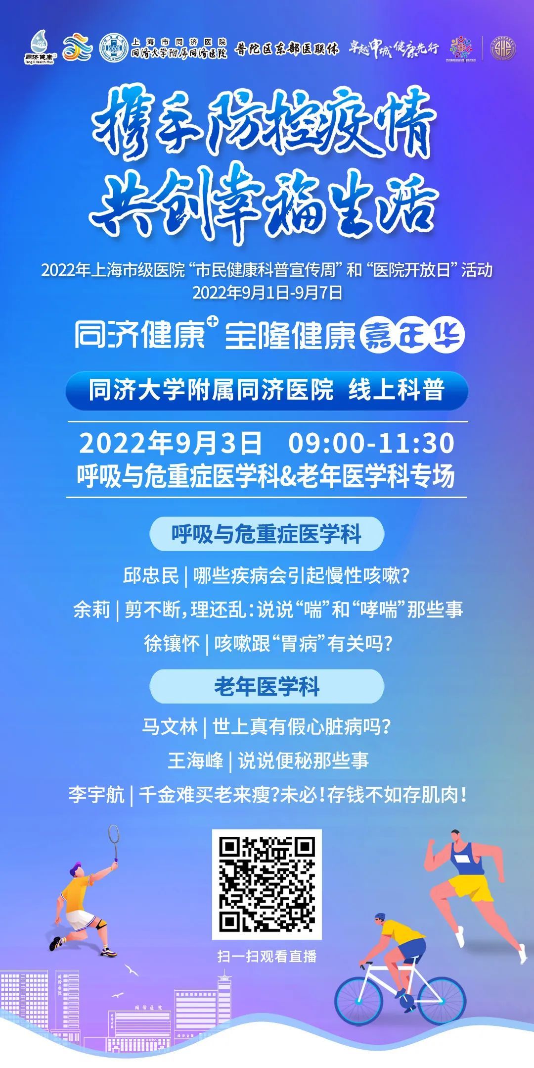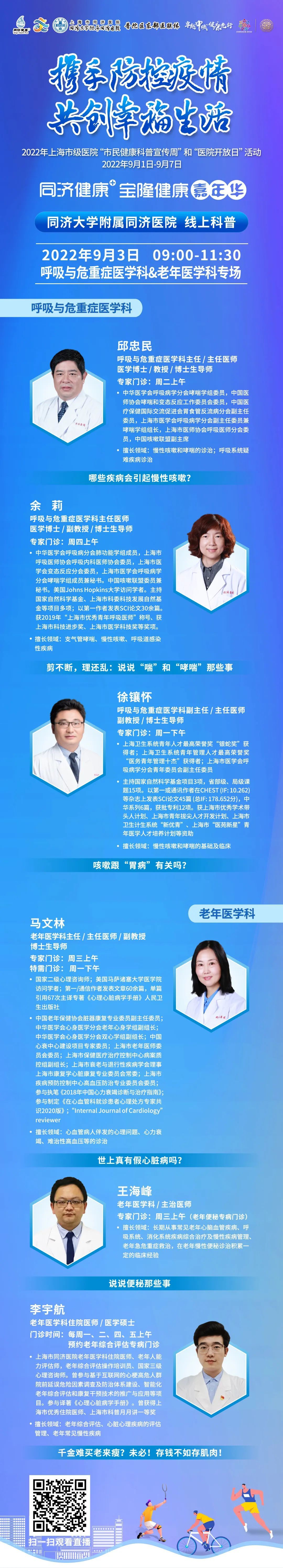 2022年9月3日上午09:00,上海市同济医院呼吸与危重症医学科&老年医学科在线上联合开展专家科普活动,向大家介绍哪些疾病会引起慢性咳嗽,说说“喘”和“哮喘”那些事,咳嗽与胃病有关吗,世上真有假心脏病吗,说说便秘那些事与千金难买老来瘦。
