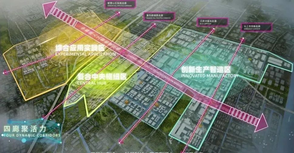 以产业优先、应用示范、产城协同为定位,试验区着力汇集全球先进城市理念和科技元素,以三区融产城、一园汇生态、一轴领科技、四廊聚活力的发展布局,全力凸显“智生产、智生活、智生态”的智慧特色。