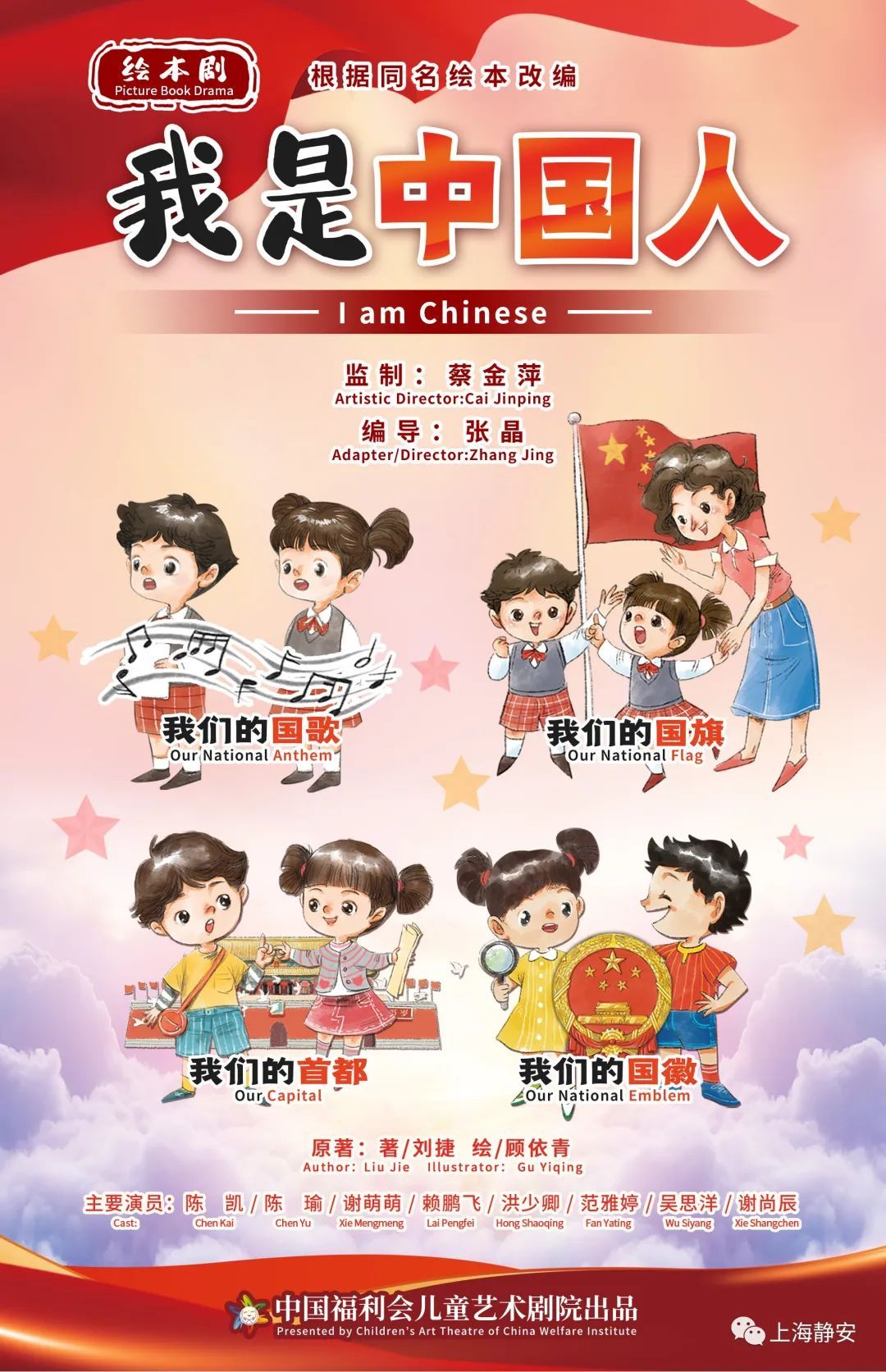 绘本剧《我是中国人》由中国福利会儿童艺术剧院出品,是一部根据中国中福会出版社同名绘本改编,以爱国主义为主题的科普类绘本剧。内容包含《我们的国歌》《我们的国旗》《我们的首都》和《我们的国徽》四部分。