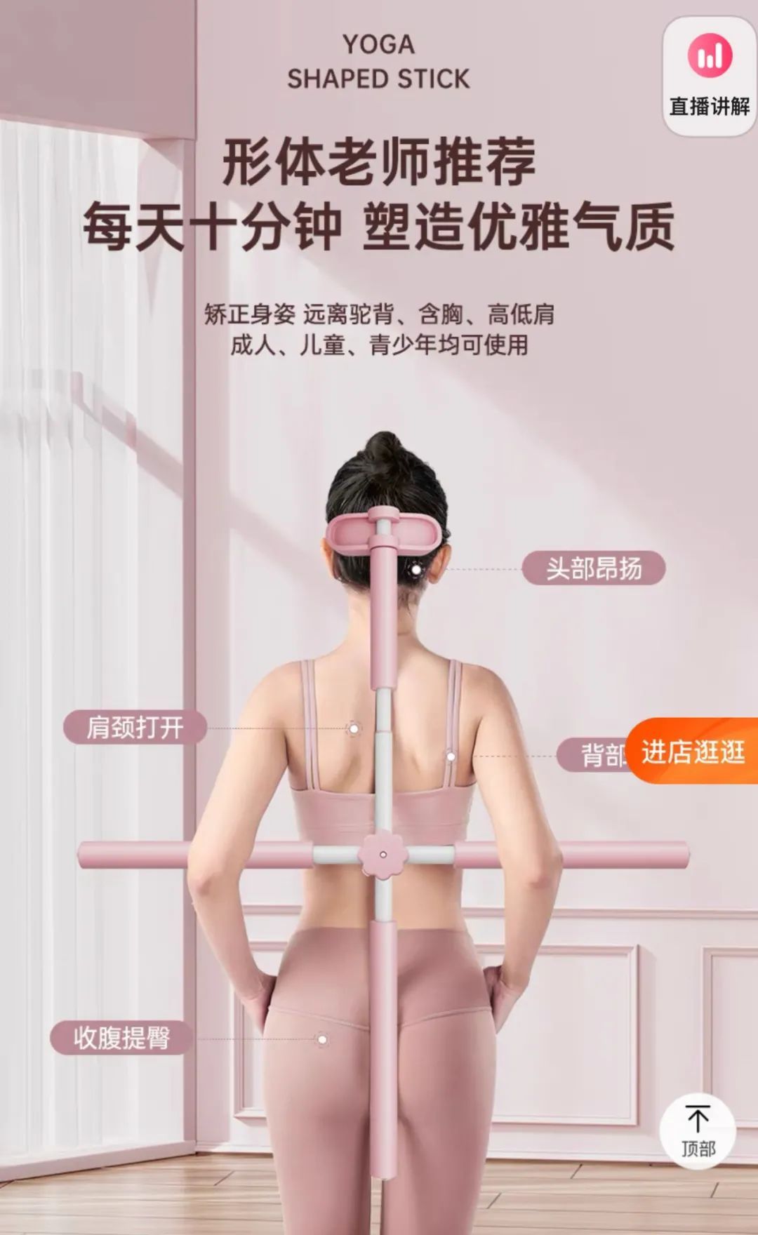 一月销量在 3 万件以上的商品详情中,写着“矫正身姿,远离驼背、含胸、高低肩”等字样,还标注着“成人、儿童、青少年均适用”。客服称,该产品的使用方法为,将木棍交叉放置,卡扣卡住,站姿。要双脚并拢,膝盖夹紧,小腿肌肉收紧,大腿肌肉上提,臀部夹紧,收腹挺胸后与形体棍贴合。客服称,每天坚持 10 至 20 分钟,坚持 1 个月左右就有明显效果。