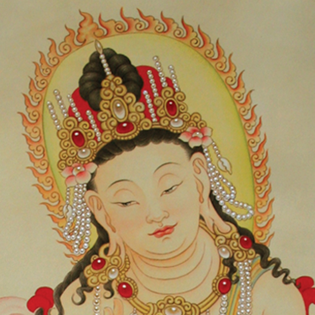 “当然,能有这么逼真的效果,也是因为羊皮画用的颜料大有讲究。我们所有的颜料都取材于珍贵天然矿物,像《观自在》中的珍珠,就用了珍珠粉。”