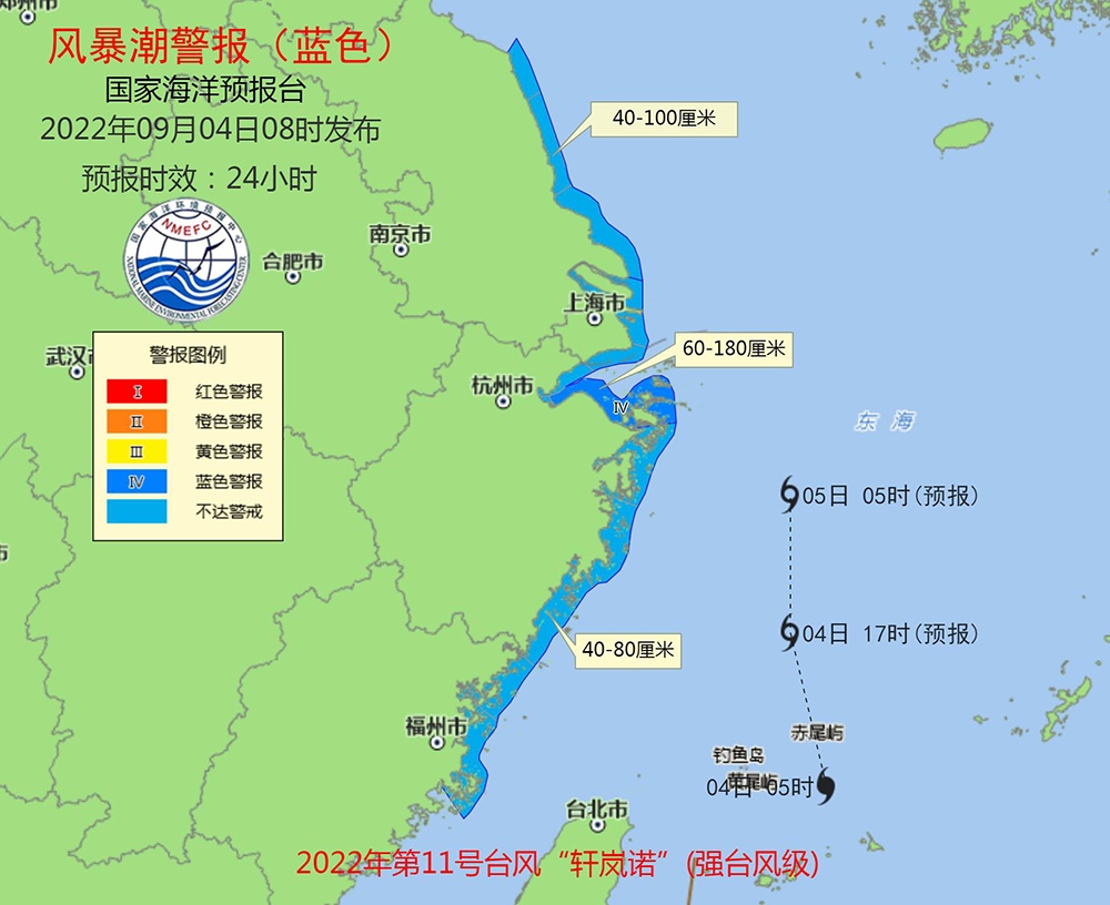 受 “轩岚诺”的影响,预计9月4日中午至5日中午,东海、台湾以东洋面、钓鱼岛附近海域将出现8到12米的狂浪到狂涛区,近海海域海浪预警级别为橙色;上海、浙江近岸海域将出现4到6.5米的巨浪到狂浪,该近岸海域海浪预警级别为红色,江苏南部、福建北部近岸海域将出现2.5到4米的大浪到巨浪,该近岸海域海浪预警级别为黄色,山东半岛东部近岸海域将出现1.5到2.5米的中浪到大浪,该近岸海域海浪预警级别为蓝色。
