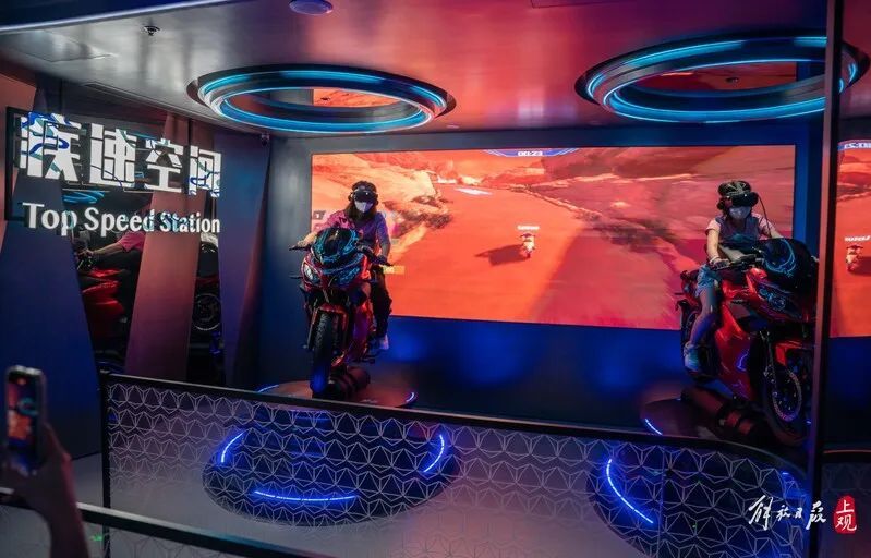 刚进门的赛马类游戏:玩法类似马里奥赛车,但玩家需要夹紧双腿以加速前进,左右拉动缰绳控制方向,座下的“独角兽”会随游戏内容晃动,提供真实的物理反馈,VR头显还能方便玩家扭头观察对手情况。一局下来,记者完全沉浸在游戏世界中,甚至因为脖子、双手、双腿不自觉地动个不停,渗出不少汗。同行的其他媒体记者“下马”后也直呼过瘾。