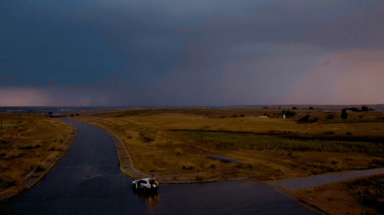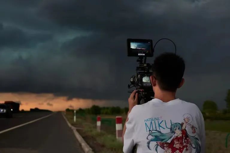 △在内蒙古追风时,苏镝坷和伙伴的追风观测车与闪电的合影。