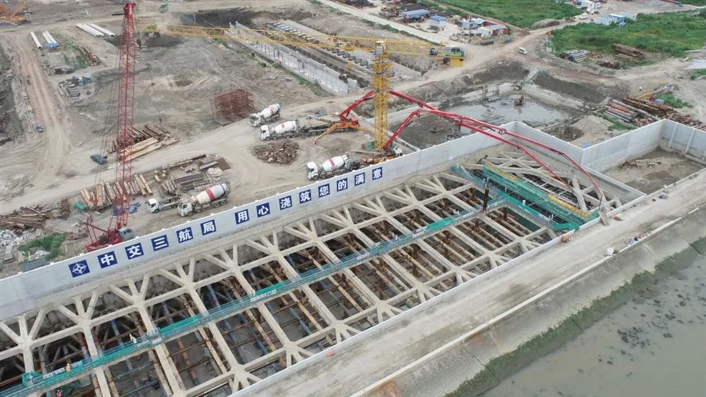 该项目于2021年9月30开工建设,合同工期730天。作为超大型水工工程,其坞口基坑底板浇筑是整个船坞施工的关键节点。自今年4月底开启“抢险式”复工以来,业主、设计和施工三方通力合作,携手并进,终于出色实现了这一重大关键节点目标。