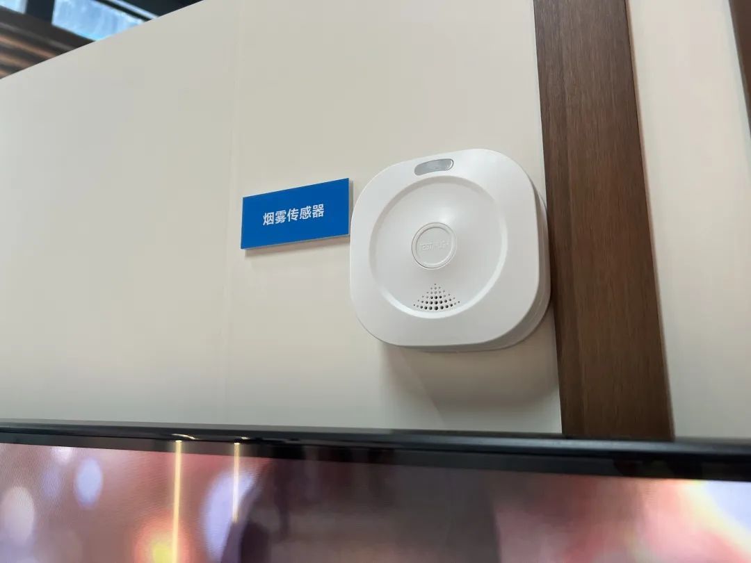 几乎每走几步就能遇到惊喜,比如入门的开放式厨房顶部,装着烟雾传感器和燃气传感器,可及时感知屋内危险情况。而当步入客厅,拥有高清晰度与色彩还原度的8K电视又让人挪不开眼。