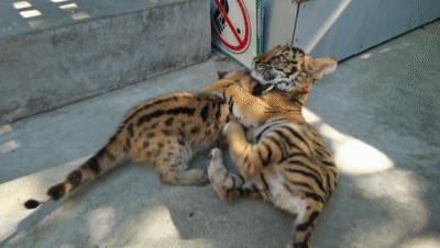原来的纸板箱已经满足不了逐渐长大的美洲狮宝宝了,常常跃跃欲试想要跳出箱子,“奶爸”便将它们转移到活动空间更大的木笼中,两个小家伙一进去就快乐地小跑起来。美洲狮天生就是攀爬能者,为了更好地激发美洲狮宝宝的运动天赋,早上凉快的时候,“奶爸”会让它们和孟加拉虎“小爱”一起在小院子里快乐地玩耍。