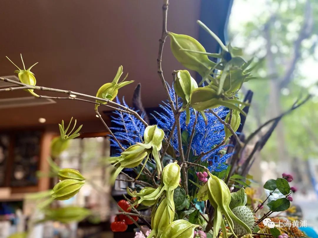 各色各异的果子,也会拿来做特殊的效果,这一支浑身带着刺胖乎乎的糖棉,被称作植物界里的河豚,单看有点别扭,混在一束花里倒是有了点别致和趣意。