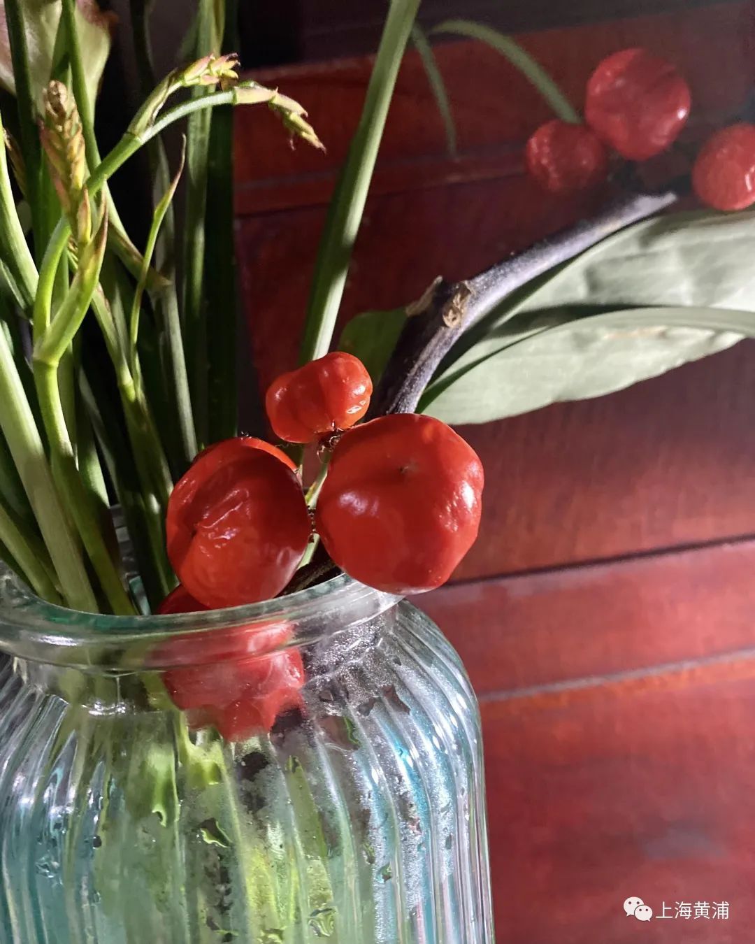 小编在插花的时候也经常会用到红豆、蔷薇果、小苹果、小番茄等果实来做点缀,增添一份收获的氛围感。