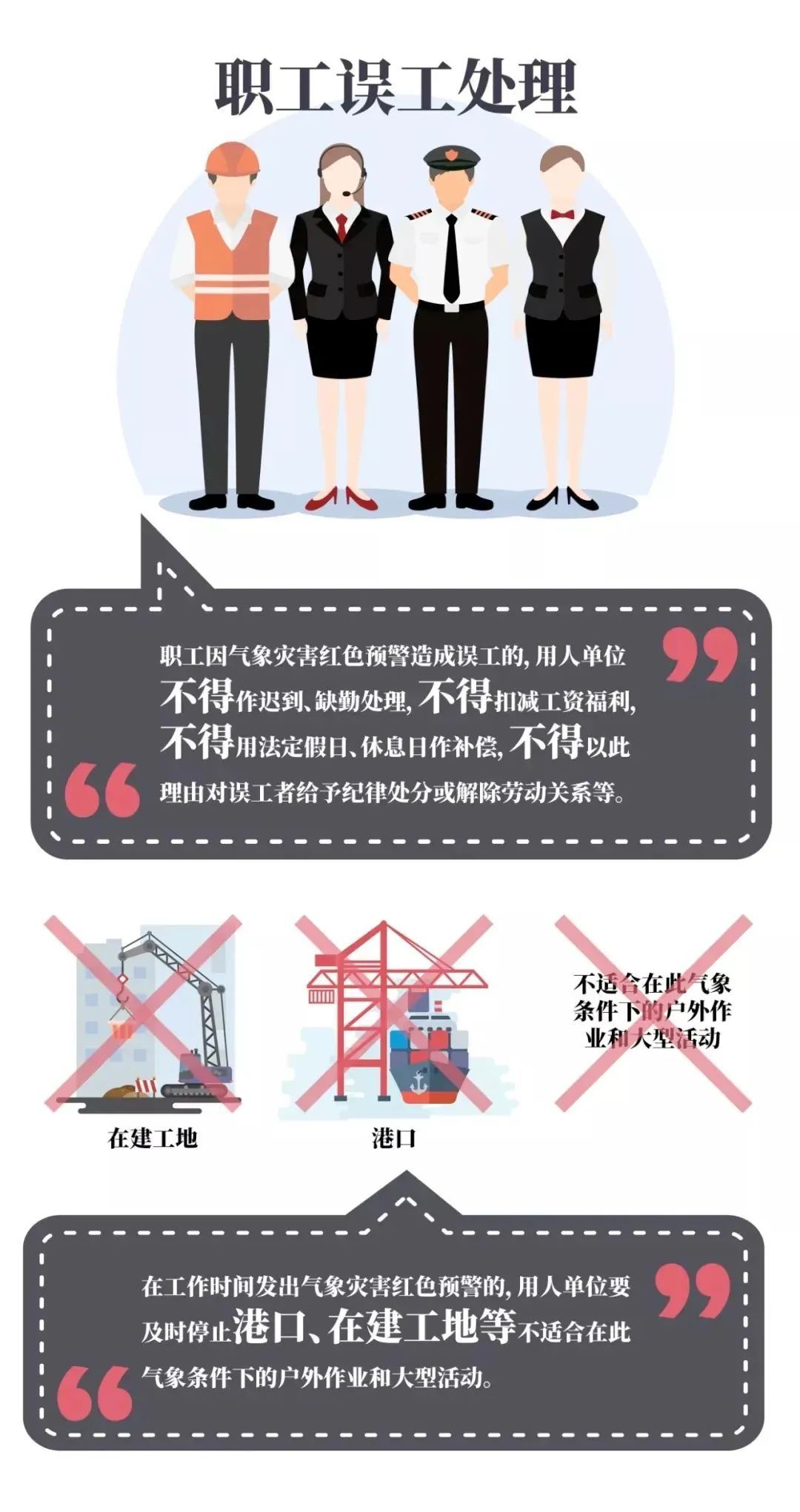 如果本市发布台风、暴雨、暴雪、大风、道路结冰等气象灾害红色预警,那么,根据上海2019年修订的《关于本市应对极端天气停课安排和误工处理的实施意见》规定:“应当上班而不能按时到岗的职工,要及时与本单位联系。职工因气象灾害红色预警造成误工的,用人单位不得作迟到、缺勤处理,不得扣减工资福利,不得用法定假日、休息日作补偿,不得以此理由对误工者给予纪律处分或解除劳动关系等。