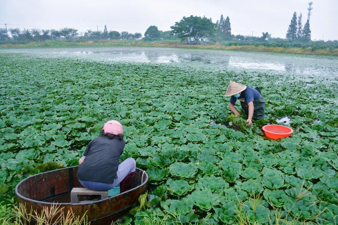 在练塘镇东田村夏介田的一处菱角种植点,大面积的菱叶犹如绿毯,托着晶莹剔透的雨后水珠,铺满了菱塘。采菱人或以手当桨划着菱桶、或身着下水裤穿梭其中,娴熟地翻动绿叶,就像“开盲盒”一样,寻觅并掰下一枚枚水灵灵的菱角,再把菱叶放回塘里,让它继续生长。