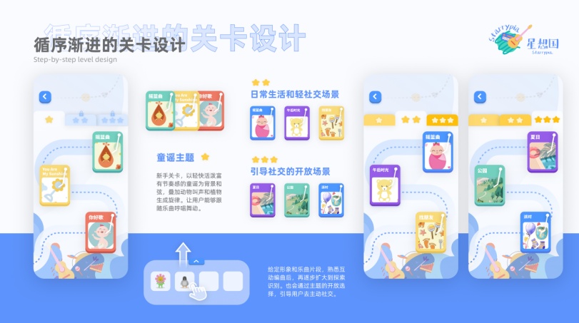 此外,他们在设计时还采取了循序渐进的等级分阶方式,从耳熟能详的童谣到日常生活和轻社交场景,再引导孩子走进大自然的场景,探索自然和音乐的融合。