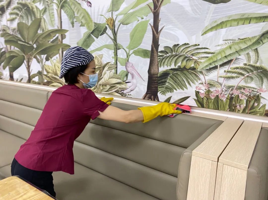 食堂严格落实防疫措施,全体工作人员每天进行核酸检测并上传至工作群,工作期间全程佩戴口罩,对用餐区域每天两次喷洒酒精消毒。二层入口处,顾客会在保安的提示下扫描“场所码”,核查健康码颜色。