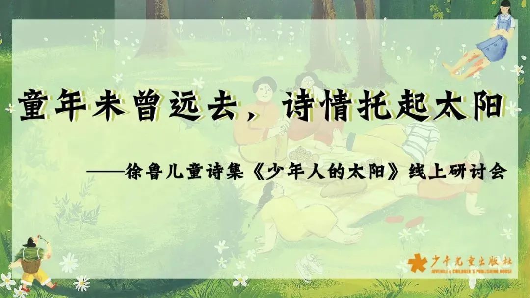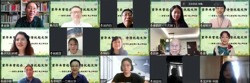 2022年9月4日上午,由少年儿童出版社主办的“童年未曾远去,诗情托起太阳”——徐鲁儿童诗集《少年人的太阳》线上研讨会在腾讯会议上召开。诗人、儿童文学作家金波教授,兰州大学文学院院长李利芳教授,太原师范学院文学院崔昕平教授,诗人、儿童文学作家刘丙钧,诗人、儿童文学作家萧萍教授,小学语文特级教师周益民,中国作协创研部发展研究处处长纳杨,本书作者徐鲁、插画师须臾,以及少年儿童出版社社长冯杰、总编辑陆小新等出席了此次会议。因故未能参会的中国作协原副主席、诗人、儿童文学作家高洪波也发来视频,对该书的出版表示祝贺并参与研讨。会议由《少年人的太阳》责任编辑韩璐主持。