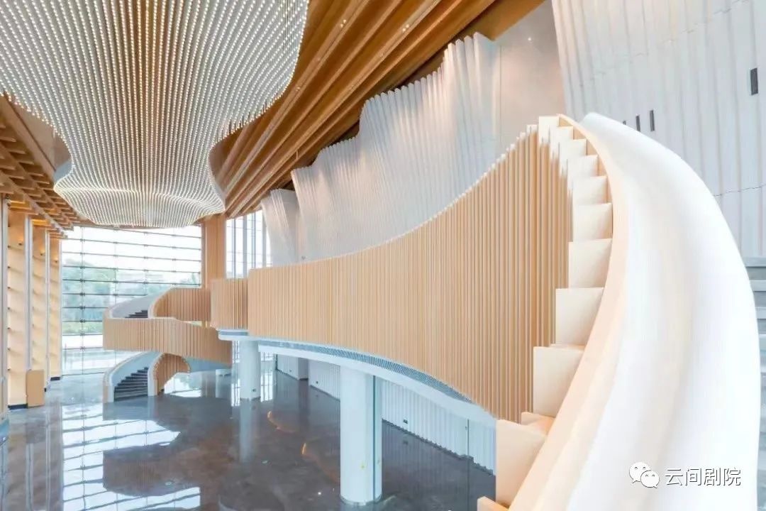 大堂两侧的楼梯造型极具艺术特色,旋转的弧形结构,似水袖扬起,展现云间剧院的灵动之美。