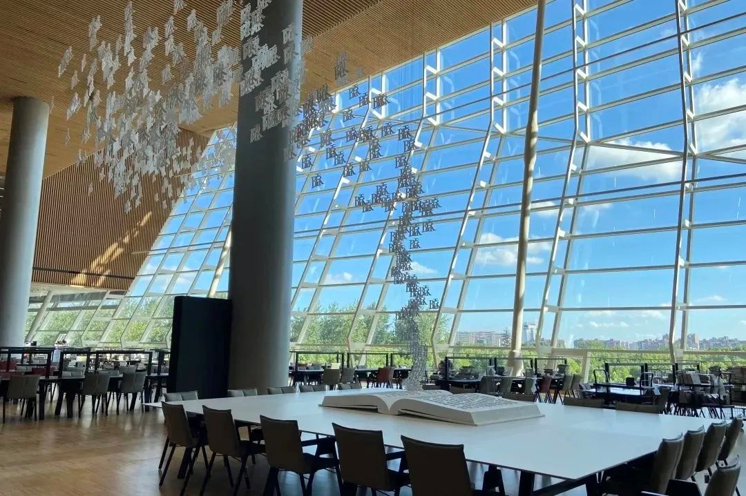 阅读广场中最醒目的存在莫过于艺术家徐冰的艺术品《鸟飞了》。这件作品将英文的字母与汉字的字形相结合,展开的书本中,首先飞出来的是四个字母“B”“I”“R”“D”,接着又经历了字形的变化,逐渐变成繁体的鸟字,到了更远处又变成了鸟的样子,仿佛即将飞出窗外。