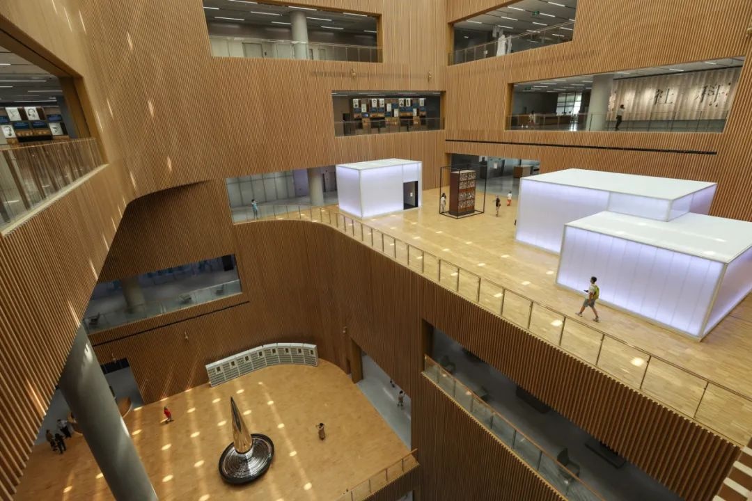 走进一楼中庭,读者抬头可见各个楼层、不同功能的开放空间,错落有致。这里采用的是上下贯通的设计,引用了苏州园林“太湖石”的概念。