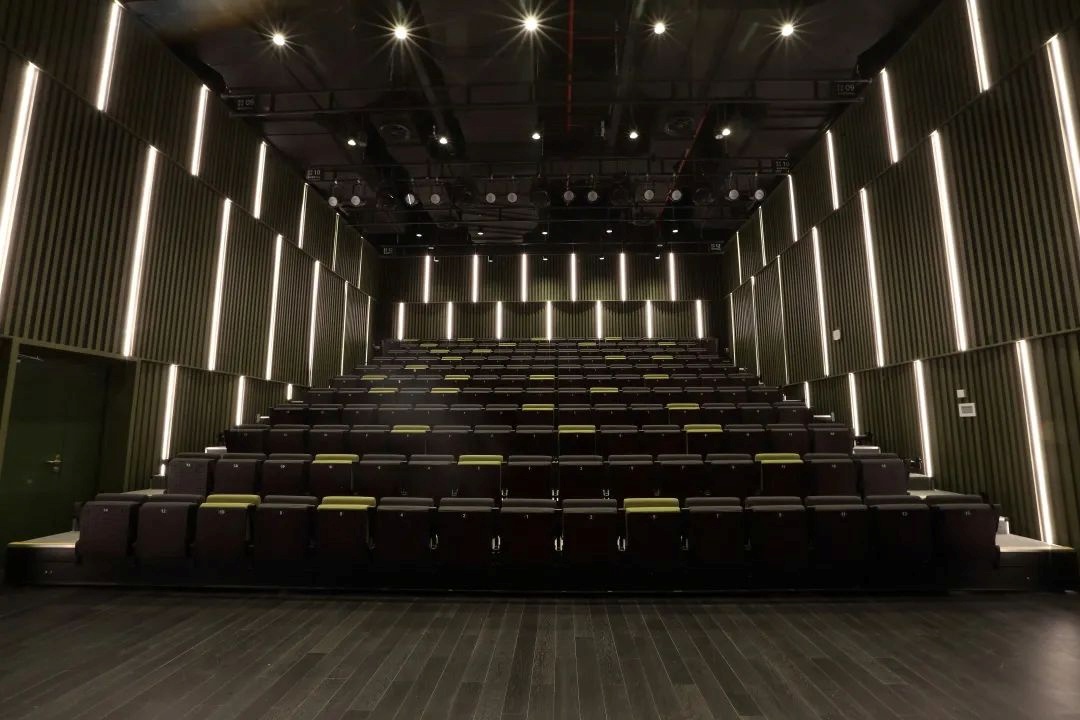 走进YOUNG剧场,随处可见的橙色元素令人感到扑面而来的活力。大面积木饰墙条如浪潮般起伏奔涌,主剧场的设计场景感十足。