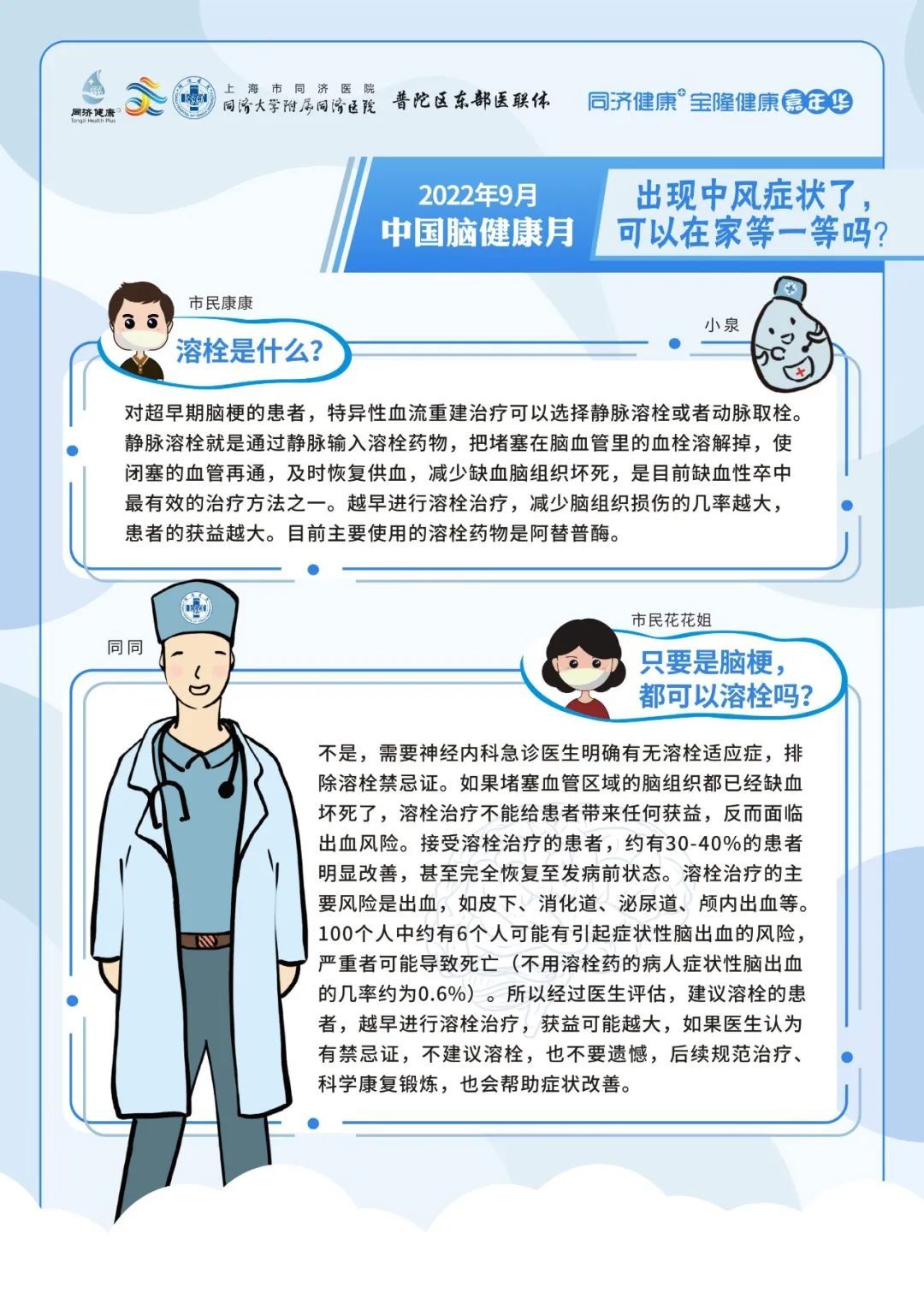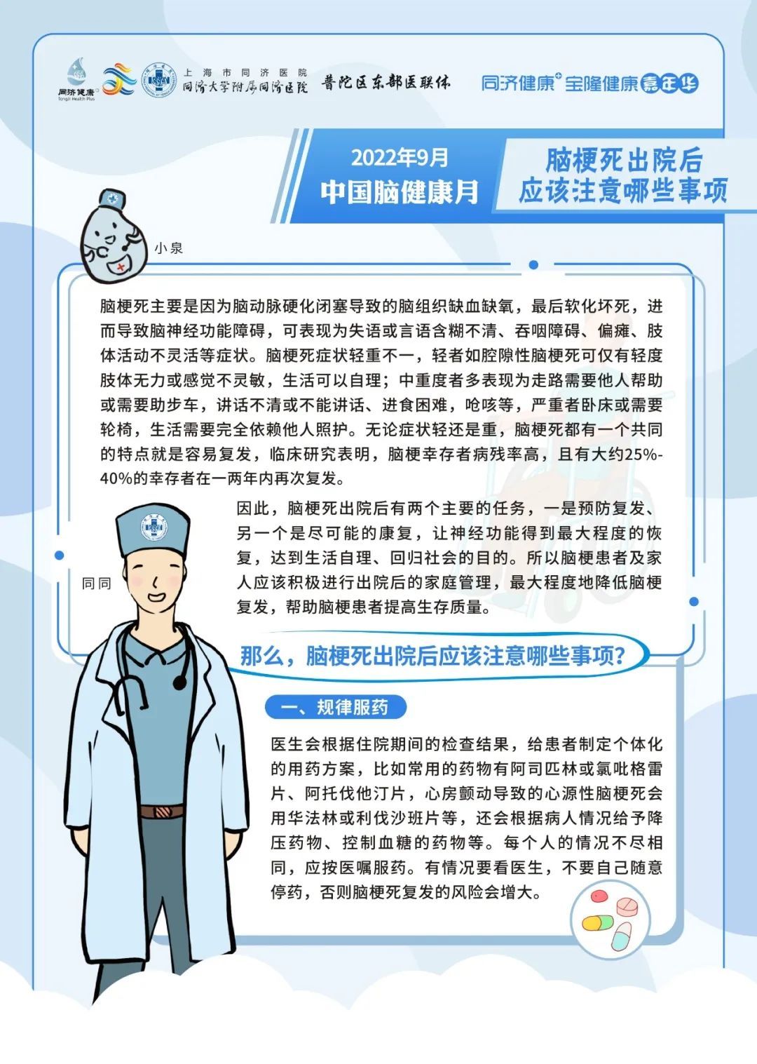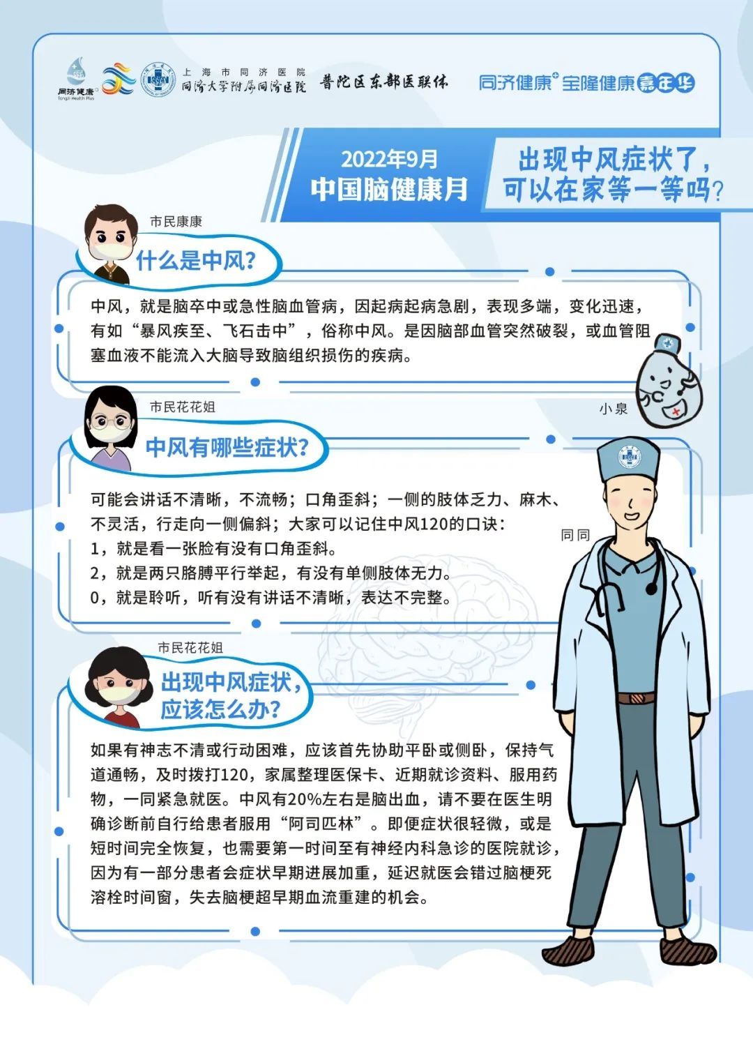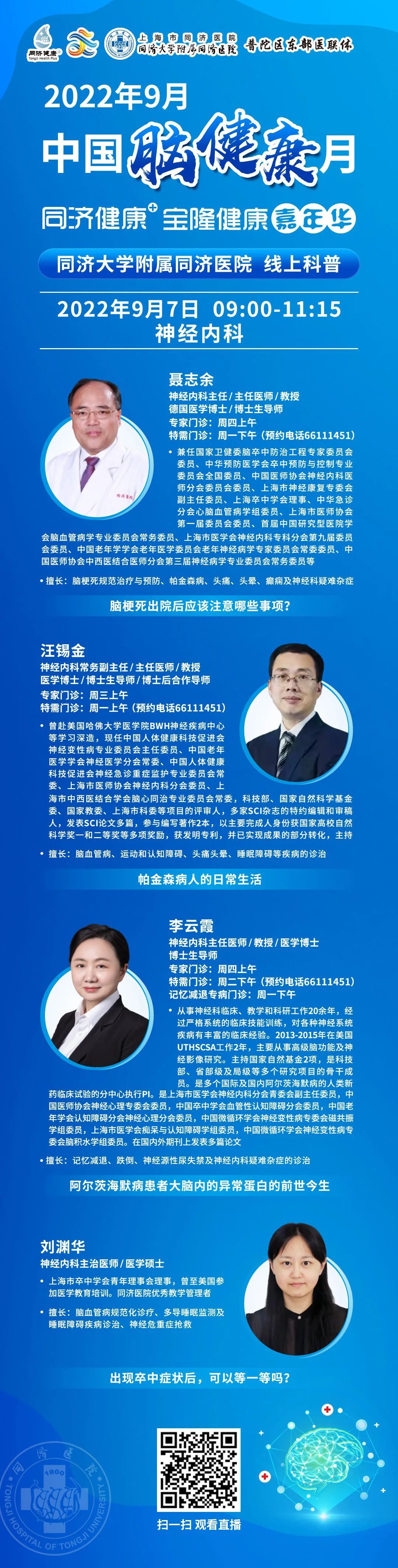 2022年9月7日上午09:00,上海市同济医院神经内科将在线上联合开展专家科普活动,向大家介绍脑梗死出院后的事项、帕金森病人的日常生活、阿尔茨海默病患者大脑内的异常蛋白的前世今生与出现卒中症状后能否等待。