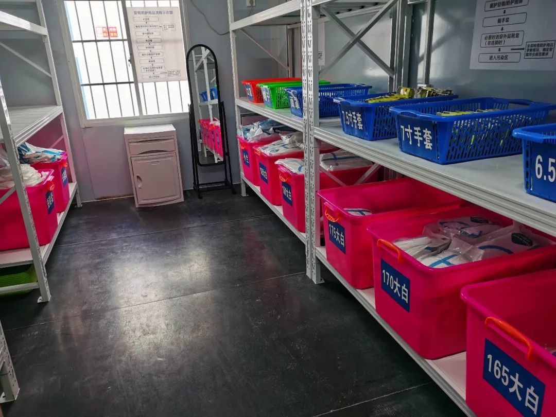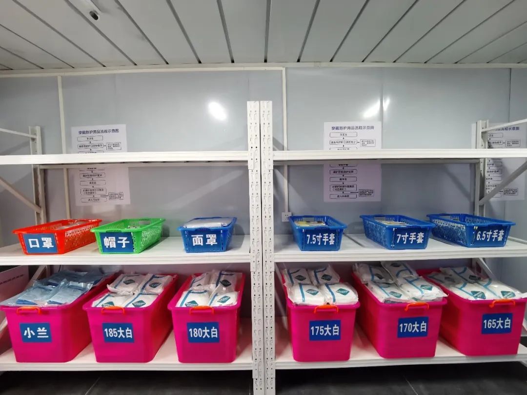 刚开舱时由于场地有限,我们只能在物资保障组办公室给工勤人员发放进舱设备,后来工勤人员有了自己的物资仓库,他们在很短的时间就完成了搬迁工作,并规范化地摆放了各类防疫物资。