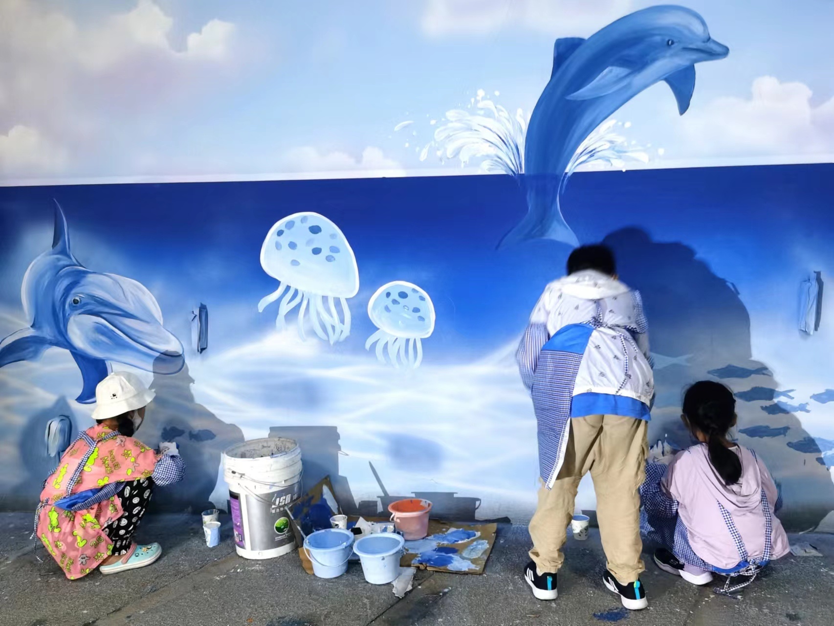 湛蓝的天空飘着朵朵白云,海豚高高跃出海面,浪花下是轻轻飘动的水母……新桥镇万科白马花园地下车库一处普通的白墙最近变成了一片“碧海蓝天”。原来,这是小区里15名小朋友合力完成的涂鸦作品。