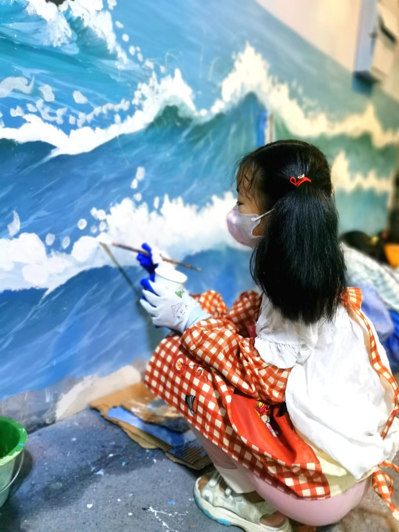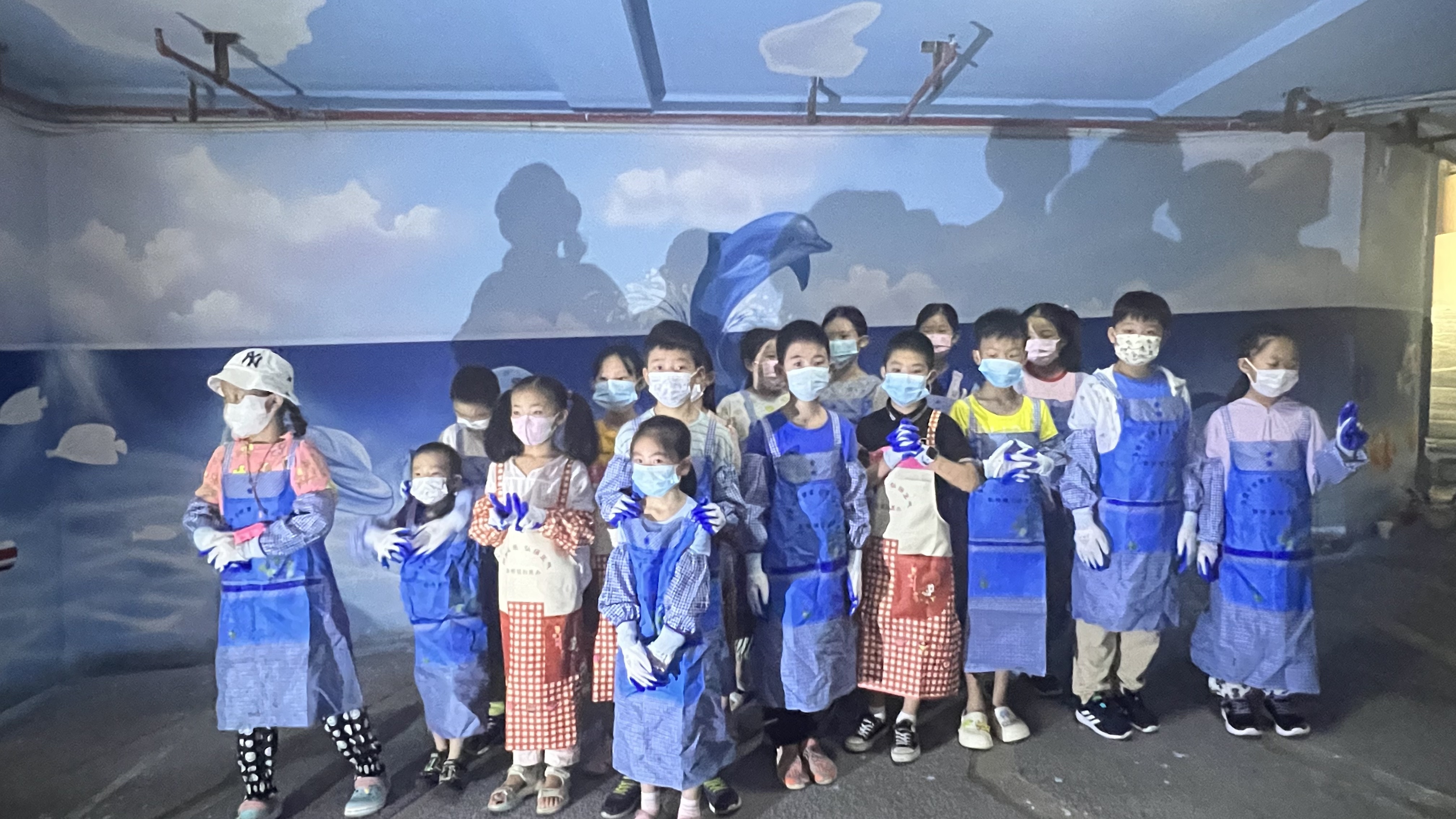 活动当天,孩子们穿戴上社区工作人员准备好的围裙和手套,在专业老师的指导下,发挥想象力开始了创作。虽然地下车库闷热不通风,但挡不住孩子们创作的热情,经过大家近4个小时的齐心协作,“碧海蓝天”跃然上墙,路过的居民们纷纷竖起了大拇指。