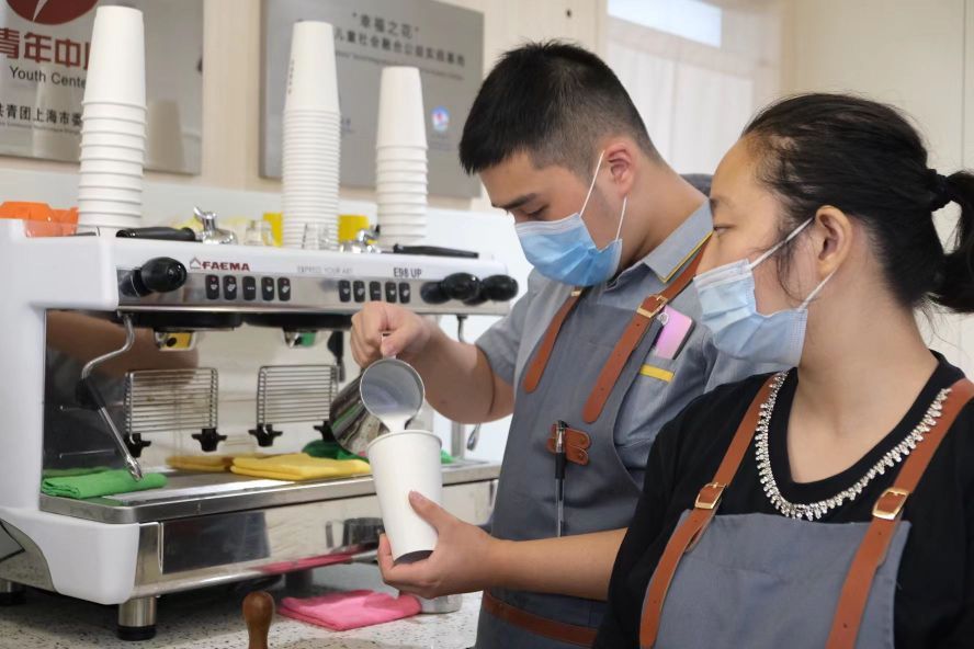 2022年年初,“幸福咖啡馆”实训基地作为“幸福之花”项目的落地形态,在文定路博爱儿童康健园楼下开业。自闭症患者在二楼接受课程培训,在一楼“幸福咖啡馆”实操训练。