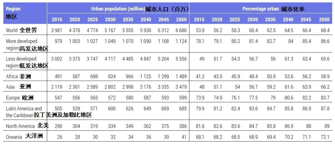 图3 世界各地区城市人口及城市化水平估算(2015-2050)