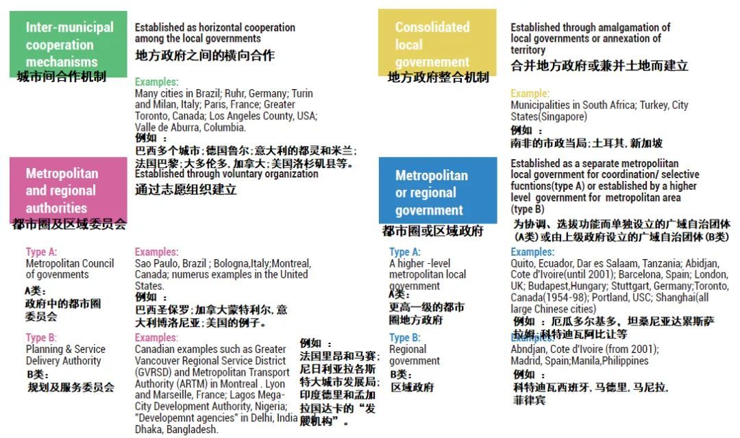 此外,都市圈(都市区)治理至少有四种不同的实施方式,包括城市间合作机制(Inter-municipal Cooperation Mechanisms)、地方政府整合机制(Consolidated Local Government)、都市圈及区域委员会(Metropolitan and Regional Authorities)、都市圈或区域政府(Metropolitan or Regional Government)(图6),其中最常见的实施机制是没有任何监管权力的城市政府间自愿合作。由于缺乏具有约束力的权威,自行组建的都市圈(都市区)协会(Voluntary Metropolitan Associations)在区域行动达成共识方面的能力有限,而大型中心城市和周边地区的城市间合作机制更可能是建立合作计划,包括都市圈外围较小城市的需求和愿景。