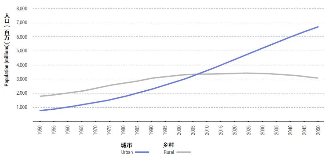 图2 全球城市及乡村地区人口变化及预测(1950-2050)