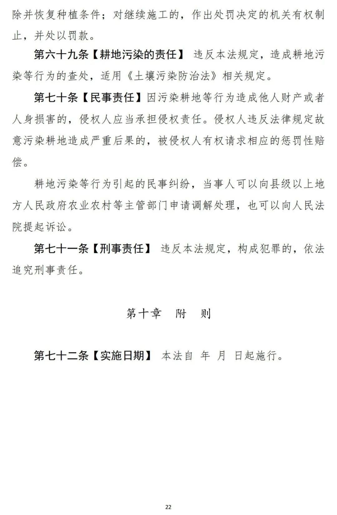 为贯彻落实党中央、国务院决策部署,健全完善最严格的耕地保护制度,根据全国人大常委会和国务院立法计划,自然资源部起草了《耕地保护法(草案)》(征求意见稿)。按照科学立法、民主立法、依法立法的要求,现将征求意见稿及其说明公布,征求社会各界意见。公众可以登录自然资源部门户网站(http://www.mnr.gov.cn)查阅征求意见稿及其说明。有关意见建议可以在2022年10月5日前通过电子邮件方式发送至:fgzqyj@mail.mnr.gov.cn。