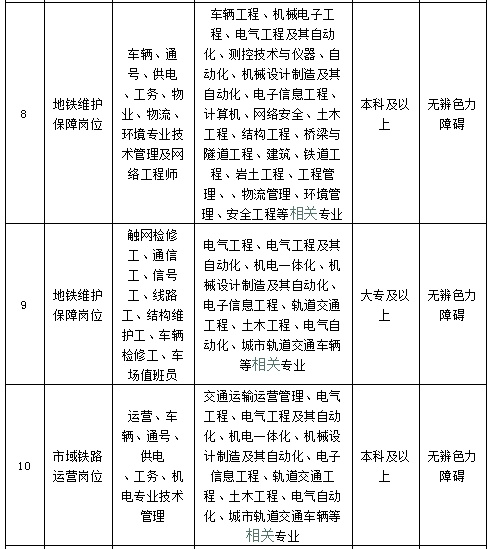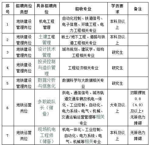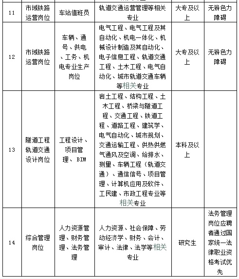 地铁建设管理岗位、地铁运营岗位、地铁维护保障岗位、市域铁路运营岗位、隧道工程轨道交通设计岗位、综合管理岗位。