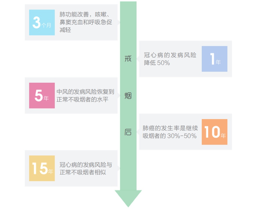 研究发现,30、40、50或60岁时戒烟可分别赢得10、9、6或3年的预期寿命;戒烟10年后,戒烟者肺癌发病风险降至持续吸烟者的30%-50%;戒烟1年后,戒烟者发生冠心病的风险大约降低50%;戒烟15年后,将降至与从不吸烟者相同的水平。
