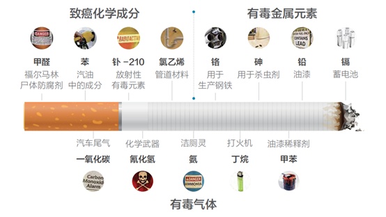 烟草烟雾中主要的有害成分有强致瘾物尼古丁、有害气体(如一氧化碳、一氧化氮、硫化氢等)、致癌物(如甲醛、N-亚硝基胺类、苯类、多环芳香烃类、放射性元素等)、重金属、挥发性有机化合物以及细颗粒物等。这些有害成分可以损害呼吸系统、循环系统及免疫系统等人体各个系统,导致各种急性或慢性炎症、脏器功能损害等,甚至诱发癌变。