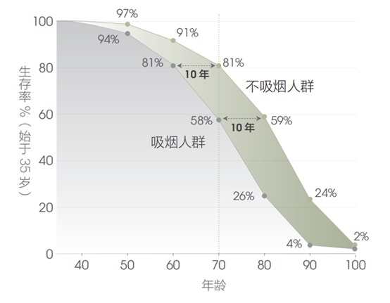 吸烟者和不吸烟者的生存曲线 | 《吸烟的危害》中国疾病预防控制中心控烟办公室