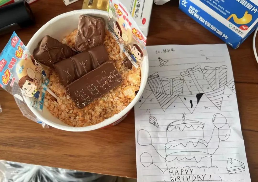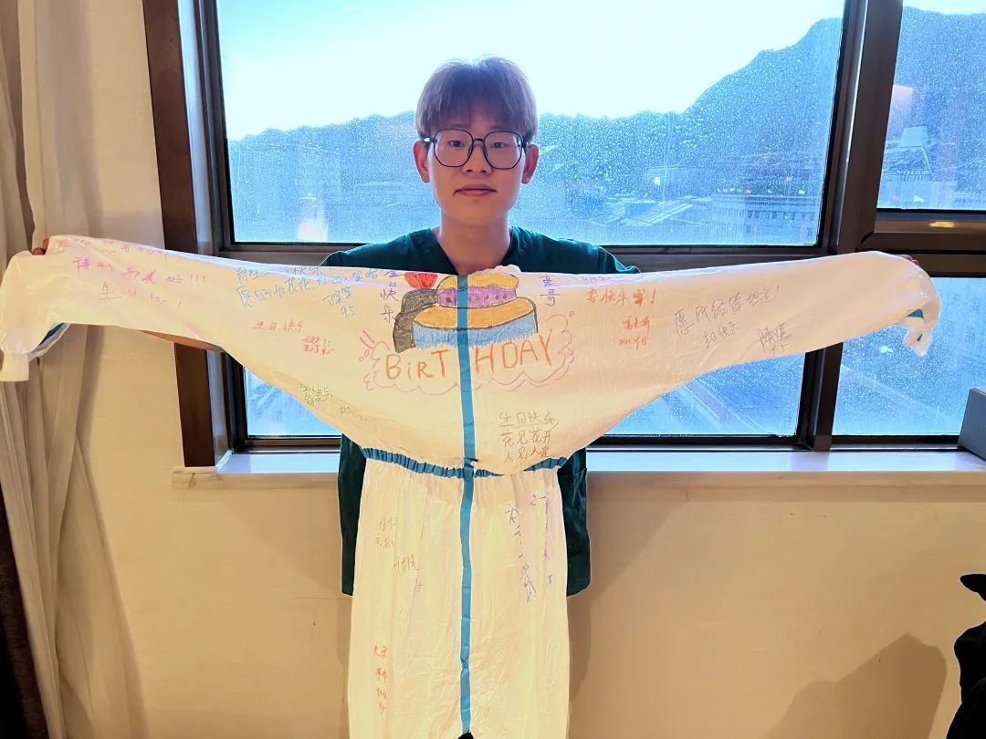 当天是徐玥豪24岁的生日,同时,他也是采样队最年轻的队员。今年,在雪域高原,队友们利用工作间隙为他准备了DIY生日蛋糕和写满祝福语的“大白”防护服,还在线上会议时给他送出了生日祝福。