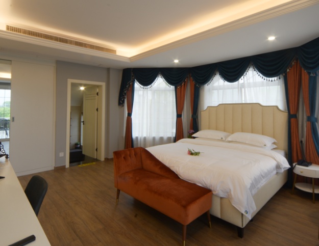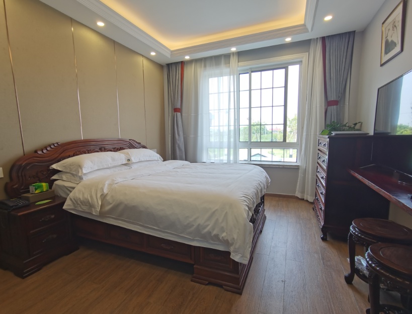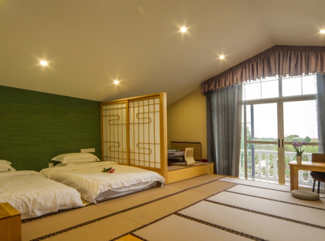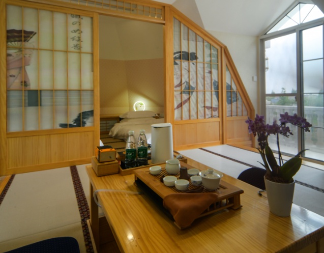 主楼的房间分为中式、欧式、日式三种风格,每种风格都让人印象深刻,房间命名也是按照房间风格来决定的,便于游客选择。中式的家具都选用老式红木家具,据说有几件中式家具还是男主人家长辈的私藏。欧式的房间清新宽敞,落地窗大阳台惬意无限。日式房间拥有榻榻米,茶具等,可谓精心布置。