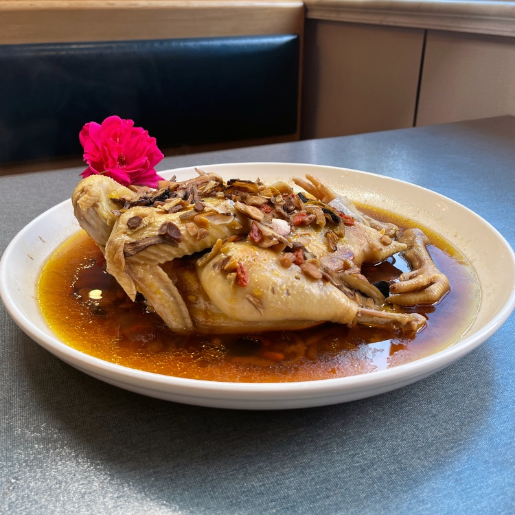 食材都选用当季的健康原料,适时而食,菜式丰富,不仅有养生药膳,如当归羊肉汤、养生八珍鸡、紫苏红烧鳊鱼等,还有崇明本地特色菜肴,如盐水花生节、崇明糕、凉拌金瓜丝等,每一道菜都精心制作,精挑细选,让人垂涎欲滴。