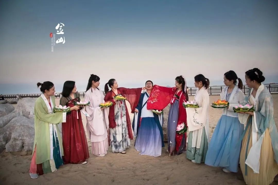 身着汉服的少男少女们拱手许愿,