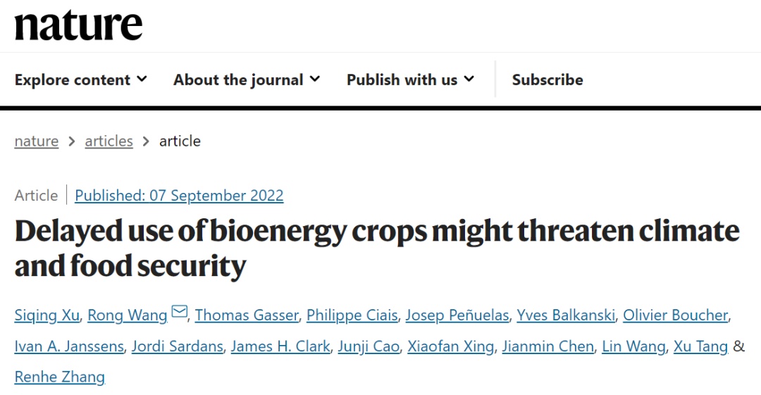 9月7日,相关研究成果以《生物质能源作物的推迟使用可能导致全球的气候与食品危机》(“Delayed use of bioenergy crops might threaten climate and food security”)为题在《自然》(Nature)杂志上发表,强调了开展早期减排的重要性。