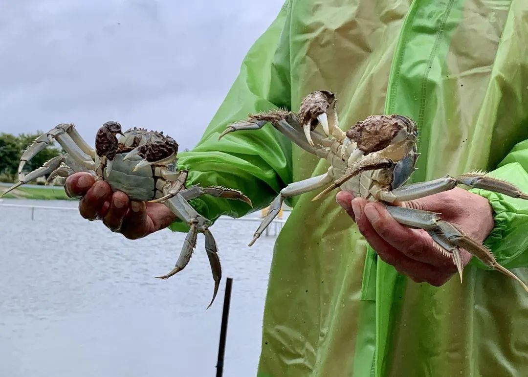 在位于小昆山镇的上海昆秀水产养殖基地,工作人员一早开始打捞水中的地笼。只见笼里爬满了手掌心大小的大闸蟹,工作人员轻扫一眼,便娴熟地从笼里挑选出已经完成5次蜕壳的成蟹。刚出水的大闸蟹就被送到与蟹塘比邻的“荡湾里蟹庄”后厨,经过精心烹饪,端到慕名而来的食客饭桌上。