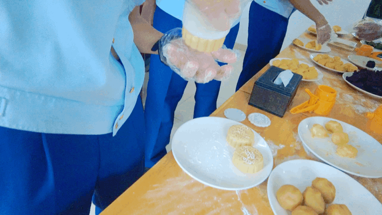前几年参加过做月饼活动的“老前辈”们,现在也当起了师傅,一边做,一边指导后辈们,大家互帮互助,分工配合,不断加工完善,一个个成品不断完成,花型各异、口味不同的月饼摆放在盘中等待烤制。