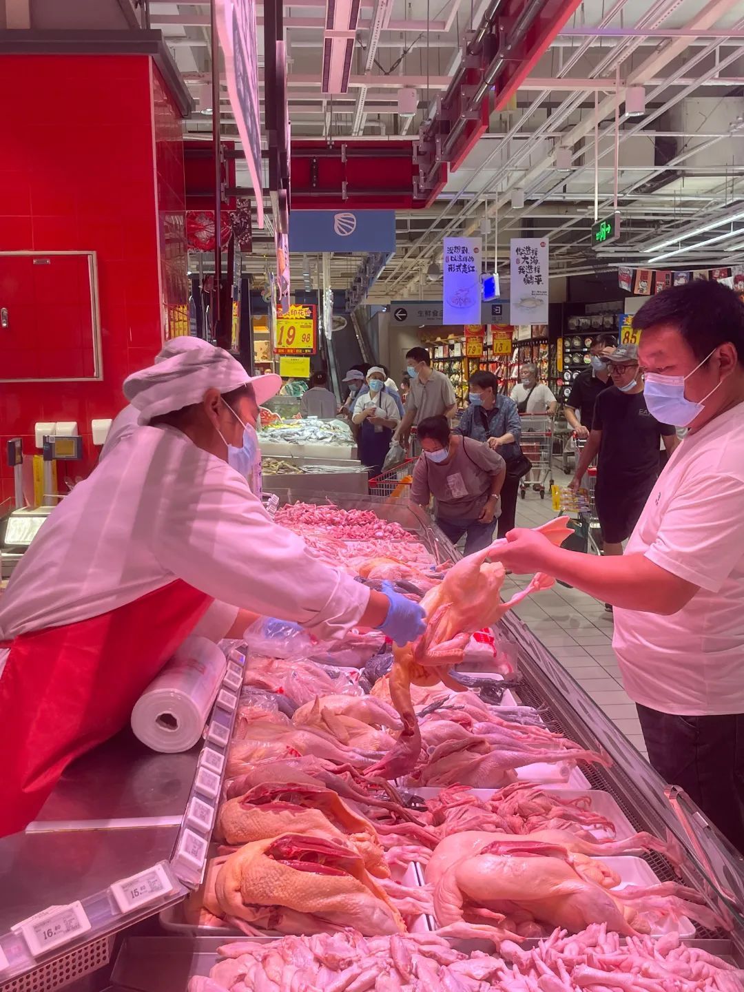 禽肉摊位前,顾客络绎不绝,中秋节“顶流”——鸭子肉质新鲜肥美。“今天的销量至少是平时的三到四倍,我们储备了两三百公斤。”超市肉品类“大师傅”高明良告诉记者,来购买鸭子的顾客大都选择老鸭,用于煲汤,“煲汤用老鸭最好,可以注意挑选头和脚发黑、脚下有老茧的鸭子。”