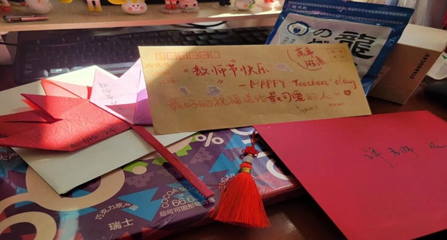 高一有些班级把黑板布置成PAD,向右拉开,“滑动以解锁”,打开满满的学生祝福,有的班级学生亲手制作贺卡,为不同学科老师定制专属祝福标签语。高二班级有的给老师们送上了亲手种植的多肉植物,有的提前录制了祝福视频,有的制作枫叶书信。其中,高二(11)班全体同学正在居家隔离,他们用40张便签组成的小视频表达了对老师们感激与敬意,同学们这些暖心的举动给老师们带来了无限的感动与温暖。高三(2)班的同学精心策划了一期限定黑板报;8班采用融媒体的方式进一步渲染了教师节的氛围,一部分线上听课的同学可以通过屏幕共享,向辛勤的老师们表示感谢。高三(11)班是充满凝聚力的新集体,大家别出心裁,统一在贺卡上签下了自己的名字,这份用心显得弥足珍贵。老师以他们最质朴的行动表达着对学生最坚定的爱,学生也利用教师节的机会用他们最有创意的方式向老师传达他们最深切的感恩。