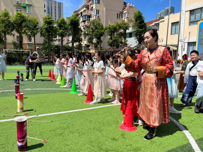 过节怎能少的了品尝美味的月饼?师生们一起品尝着美味的月饼过双节,大班的孩子们还体验了我国古代传统民间游戏“投壶”。