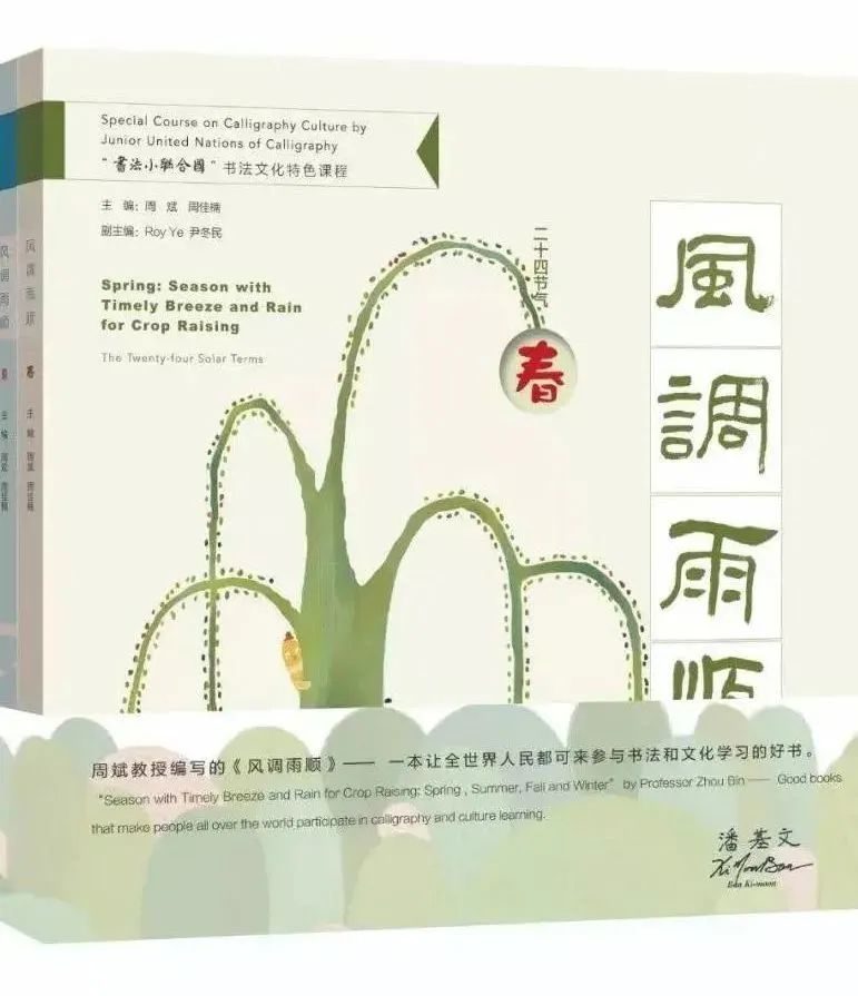“二十四节气传统文化特色读本”——《风调雨顺》,以二十四节气为切入点,融合传统文化教育和书法教学,图文并茂。一方面以中国妮妮和美国杰瑞讲故事的形式展开情节,介绍二十四节气的气象文化、农事特点、民俗习惯等内容;另一方面,通过展示相关汉字的构字起源、字形特点、书写方法、剪纸艺术等,帮助不同文化背景的学生认知汉字文化。