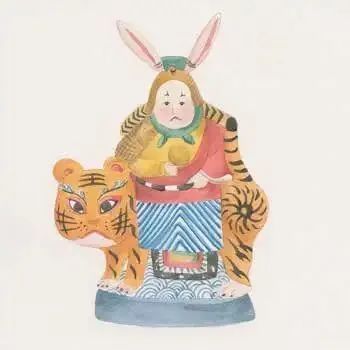 ☉ 兔儿爷玩偶大约起源于明末,明人纪坤《花王阁剩稿》中记载:“京中秋节多以泥抟兔形, 衣冠踞坐如人状, 儿女祀而拜之。”到了清代,此俗大盛,兔儿爷不只是祭月的陈设了,更成为了儿童的中秋节玩具,其形制也日趋精致与多样。兔儿爷大如三尺, 小如三寸, 粉白面孔, 左手托臼, 右手执杵, 做捣药状, 较普遍的样式是头戴金盔、身披战袍、背插令旗或伞盖的,或坐或立,坐骑有麒麟、狮、虎、鹿、象等。此外, 也有扮成兔首人身之商贩、剃头师父、缝鞋的、卖馄饨茶汤的,种类繁多,不一而足。旧历八月之时,设摊于街头,“儿女先时争礼拜, 担边买得兔儿爷”。