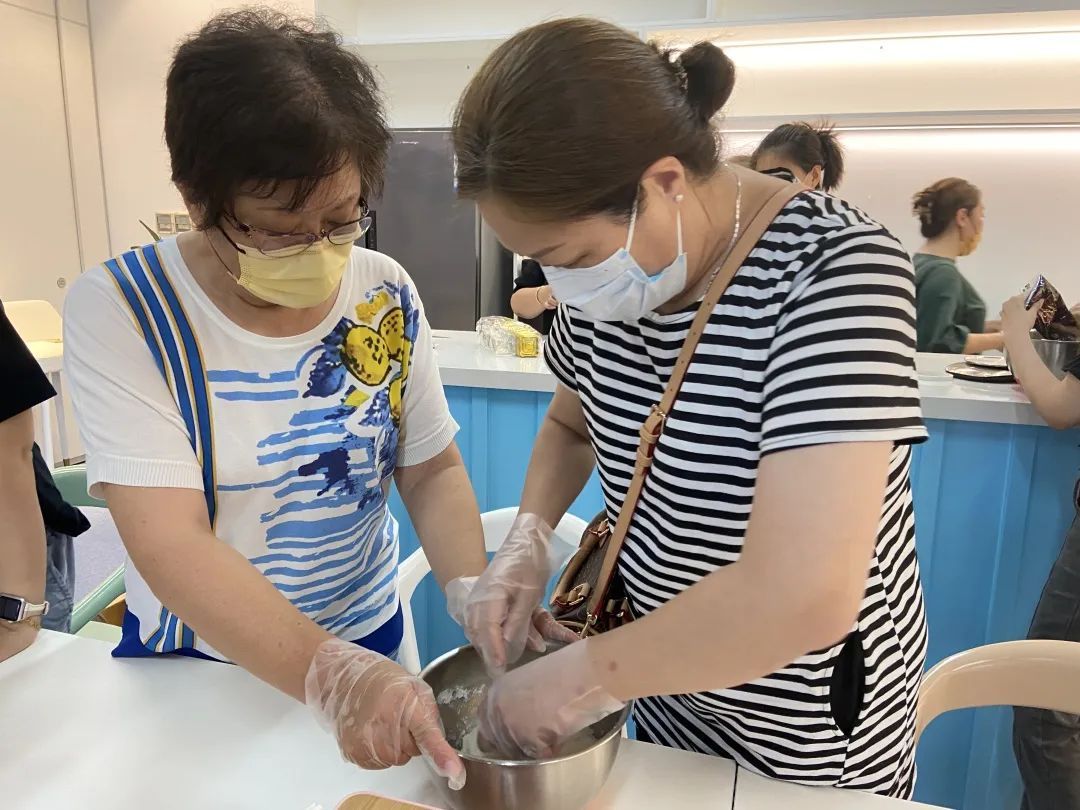 活动伊始,社工与居民们畅谈“中秋月饼的前世今生”,聊到月饼的起源、演变,以及形态各异、口味不同的各个品类,冰皮月饼是一种制作方便、容易上手又不失美味的新型月饼。